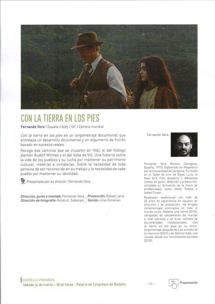 La película ‘Con la tierra en los pies’, dirigida por Fernando Vera tendrá su estreno mundial este sábado 14 de marzo en Espiello, Festival Internacional de Documental Etnográfico de Sobrarbe, a las 18 horas en el Palacio de Congresos de Boltaña con presencia del equipo.